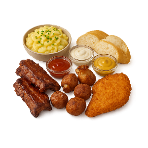 Spare Rips, Minihaxen, Partyfrikadellen und Partyschnitzel dazu Kartoffelsalat, Dipsoßen Baguettebrot