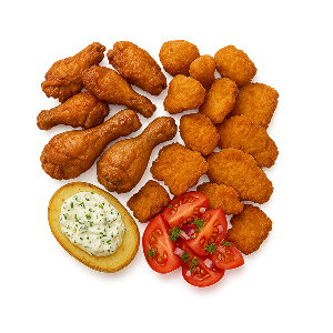 Chicken Wings, Hähnchenkeulen, Hähnchennuggets und Party-Hähnchenschitzel, dazu Ofenkartoffeln mit Landquark und Tomatensalat
