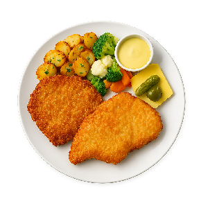 Schnitzelplatte mit Schweine- und Hähnchenschnitzel dazu Bratkartoffeln, Kaisergemüse und Sauce Hollandaise