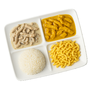 Sahnegeschnetzeltes, Putengeschnetzeltes in Curry Fruchtsoße, dazu Reis, Spätzle