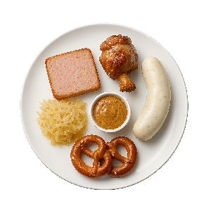 Bayrischer Mini-Leberkäse, Mini-Haxen und Bayrische Weißwurst dazu Sauerkraut, süssem Senf und Brezeln