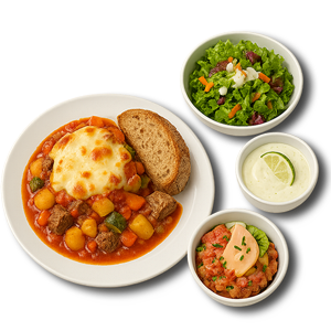 Tomatierter Kartoffel-Gemüse-Auflauf mit Rindfleisch überbacken mit Mozzarella und würziges Bauernbrot