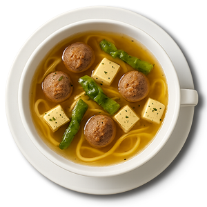 kräftige Hühnerboullion mit Mettbällchen, Spargel, Eierstich und Nudeln